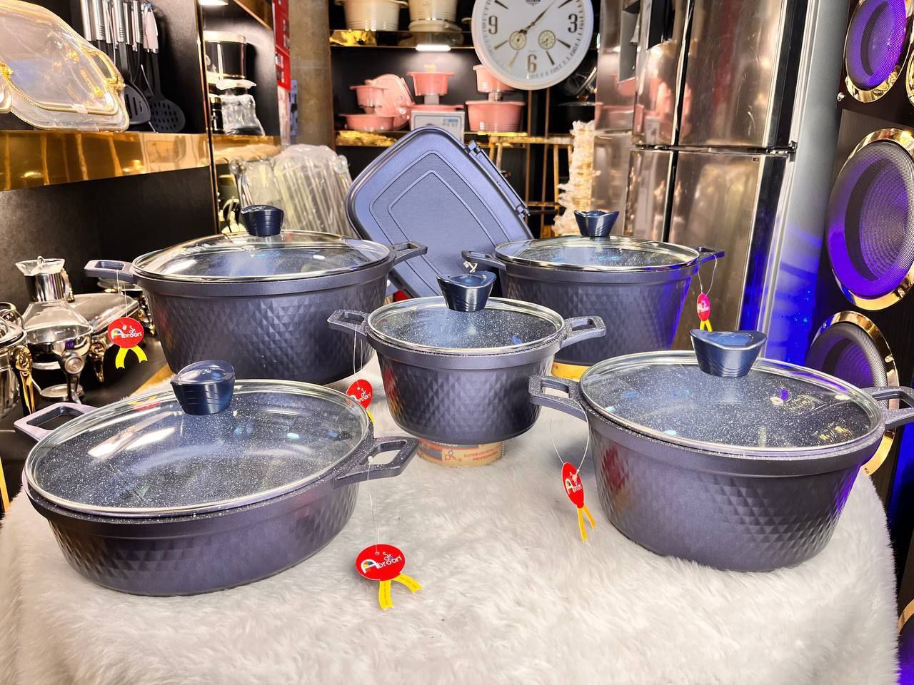 سرویس قابلمه ۱۲ پارچه آبرون Abroon – چدن داخل گرانیت، طرح دیاموند، رنگ سرمهای و مشکی